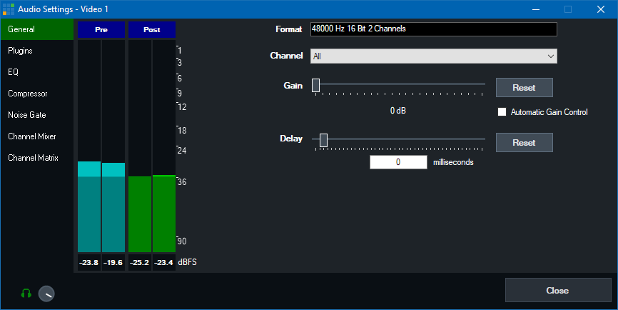 These audio meters can be used to monitor the audio audio at the pre-effects stage (for any effects, volume or gain, including delay)