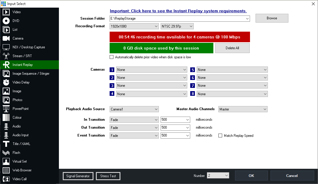 Select any Camera input already added to vMix here, if you add an input later on you can revisit this configuration window by clicking the cog icon in the Instant Replay Controller window.
