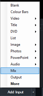 To add a Mix input, click the arrow next to Add Input in the main vMix window and click the Mix option.