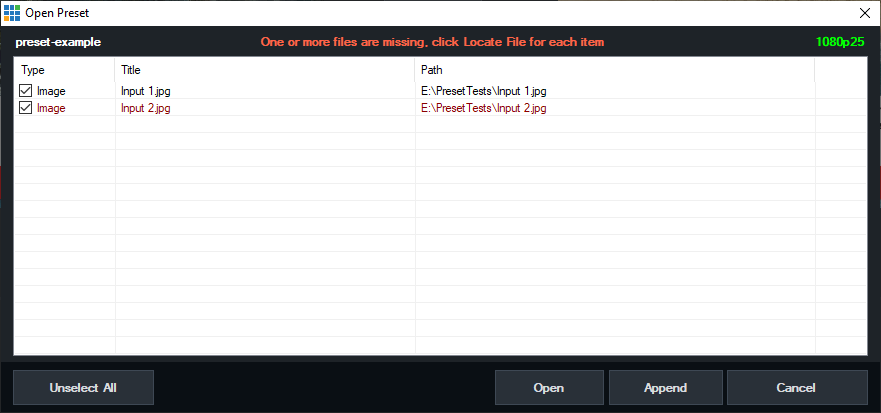High light each item in red and a Locate File button will appear. Click this button to browser for the file. If the file cannot be found, it will be added to vMix in offline mode and can't be used until the file is located manually by right clicking the input and selecting Change.