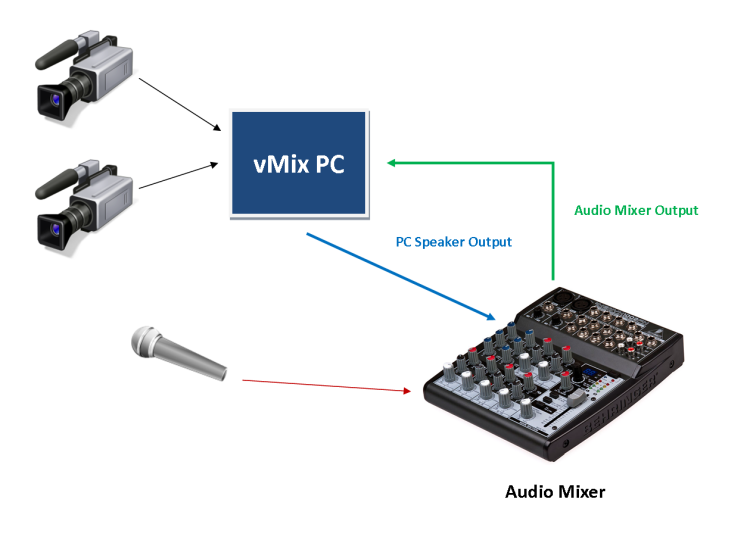 In the diagram above, all audio sources such as Microphones and Cameras run directly into vMix.